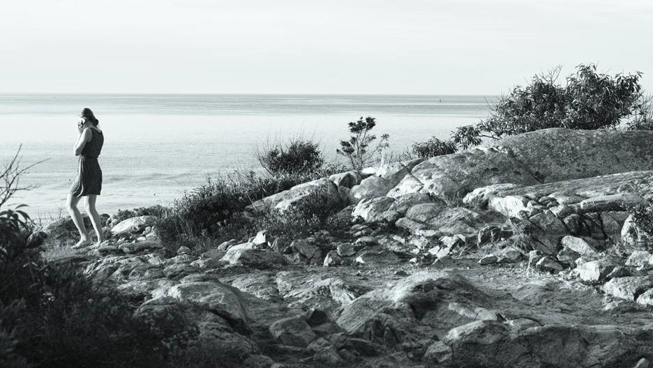 A random figure in a study of rocks and sea