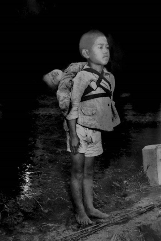 The image was taken by Joe O’Donnell, a US Marine photographer after US forces dropped atomic bombs on Japan at the end of World War II. The photograph shows a boy waiting in line as he carries his dead five-year-old brother to the crematorium. A poignant and truly sad image. O’Donnell spent the next four years documenting the aftermath of the bombings and their impact on the population.